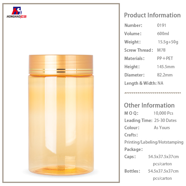 all kinds of food packaging: 600ml candy bottles, medicine bottle, tablet bottle, honey bottle, honey jar, capsules bottle, health bottle